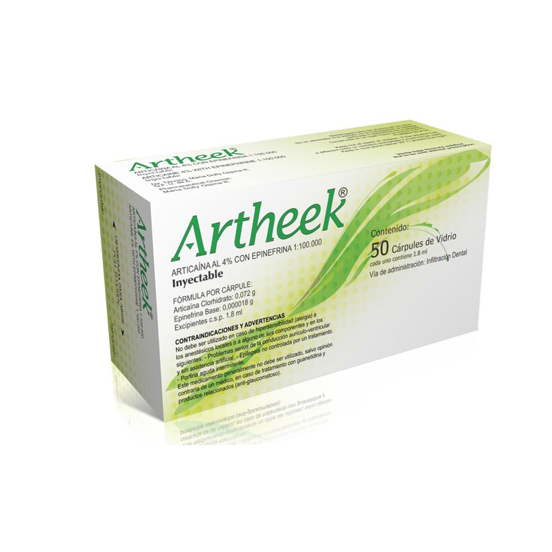 Artheek is a dental injectable solution containing 4% Articaine and 1:100,000 Epinephrine, designed for infiltration dental anesthesia. Each cartridge contains 1.8 mL of solution with 0.0072 g of Articaine hydrochloride and 0.000018 g of Epinephrine base per cartridge. The pack includes 50 glass cartridges, ensuring efficient delivery for dental procedures.