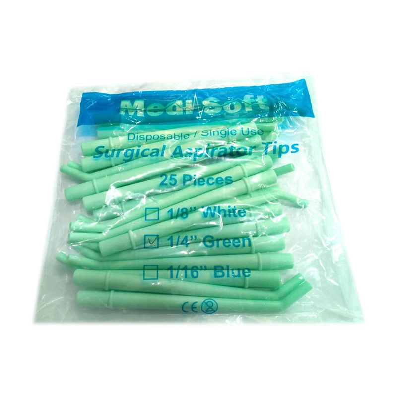 These Surgical Aspirator Tips are designed for disposable, single-use applications in medical and dental procedures. Each pack contains 25 pieces, with a variety of sizes: 1/8″ (White), 1/4″ (Green), and 1/16″ (Blue). These high-quality tips are ideal for suction and efficient material removal during surgical procedures.